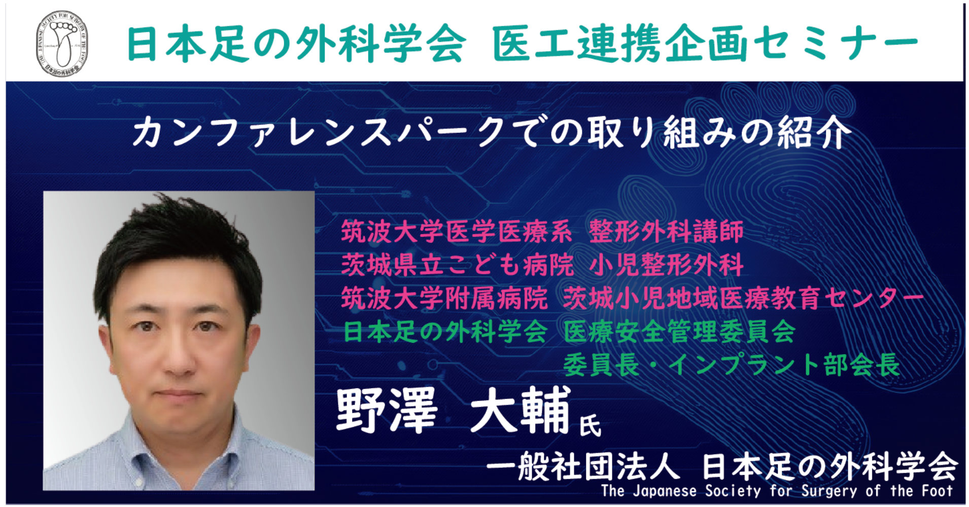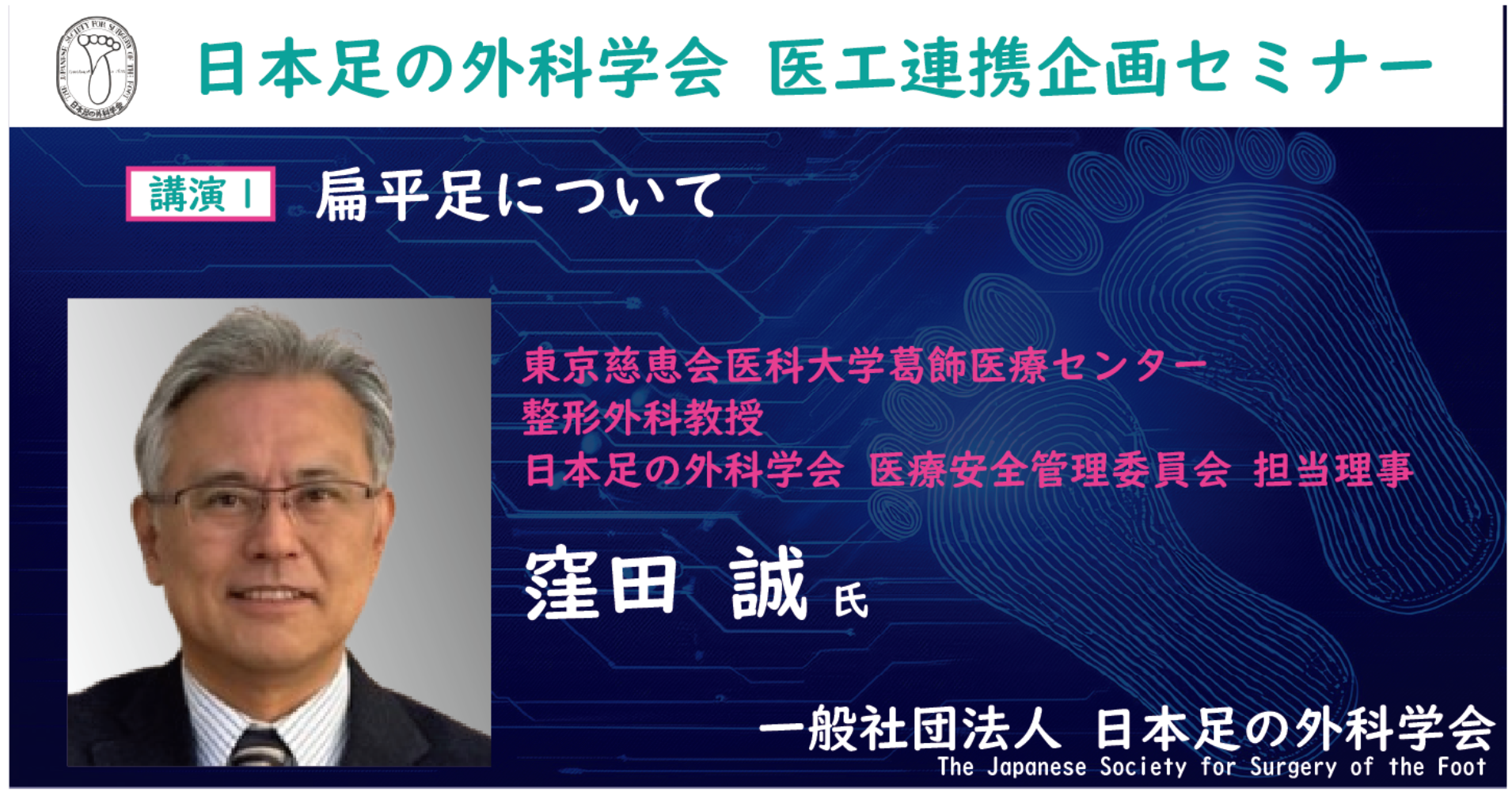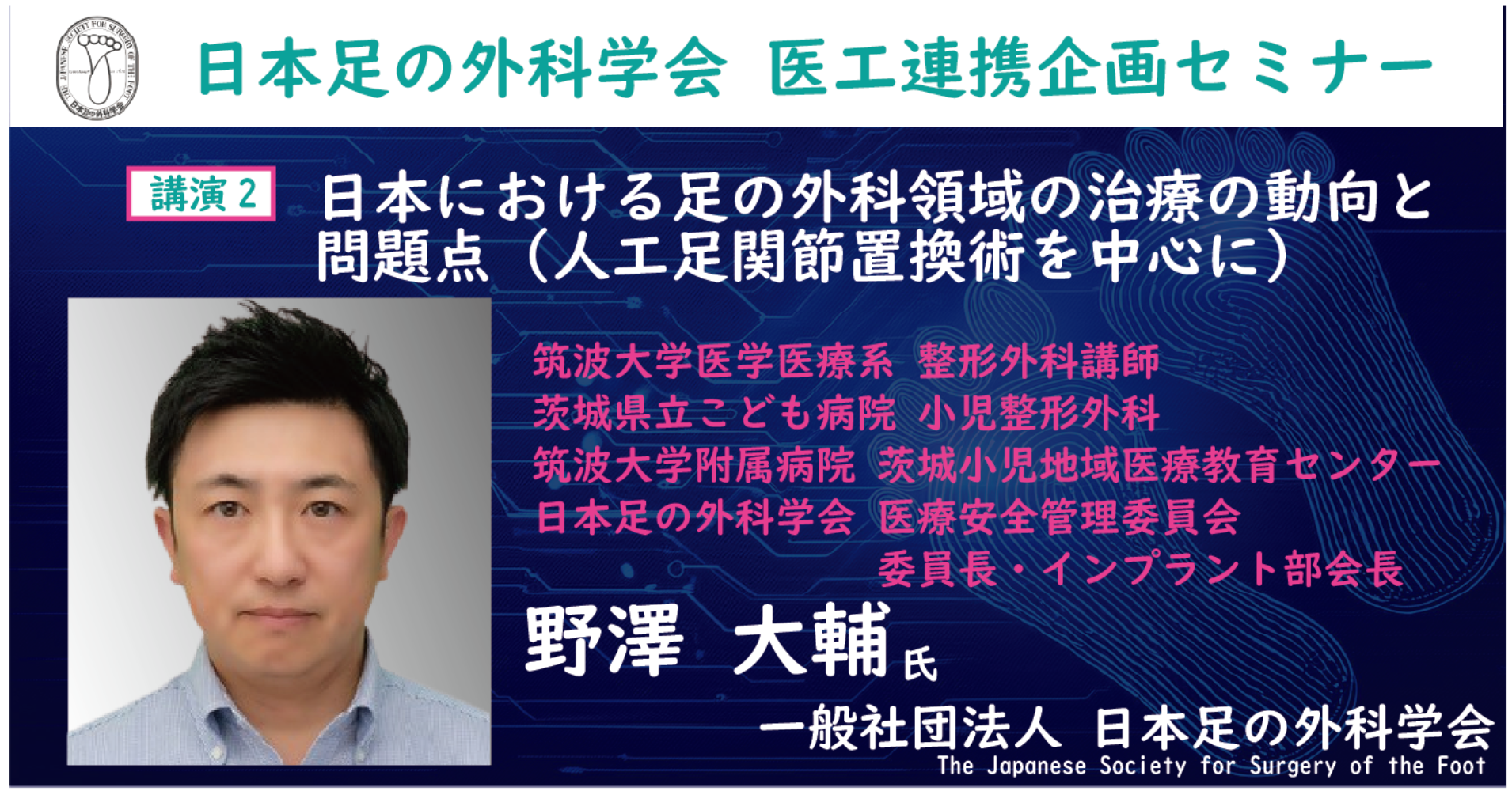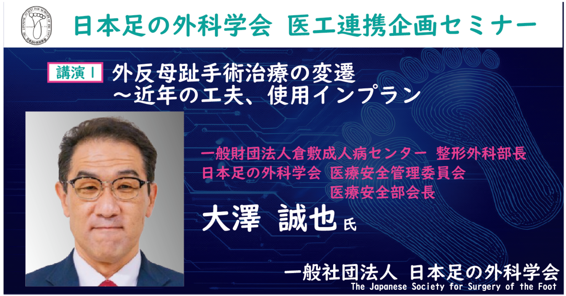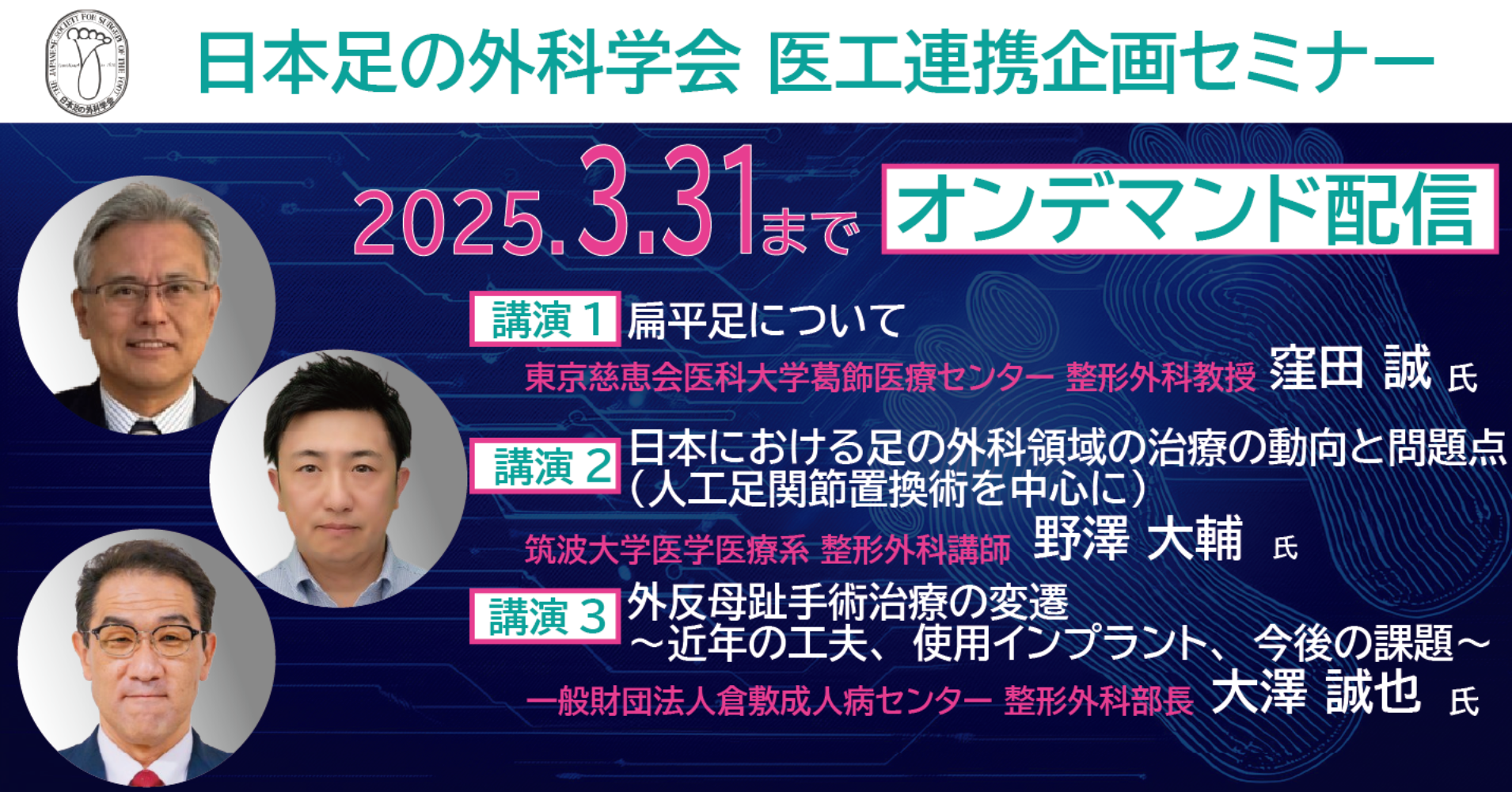 第1回目となる本会では東京慈恵会医科大学葛飾医療センター 整形外科 教授 窪田 誠 先生、筑波大学医学医療系 整形外科 講師 野澤 大輔 先生、一般財団法人倉敷成人病センター 整形外科 部長 大澤 誠也 先生の3名の足の外科専門医より、日本足の外科学会医工連携事業の取り組みと現場での実態、最新の動向、今後の課題・展望について講演いたします。