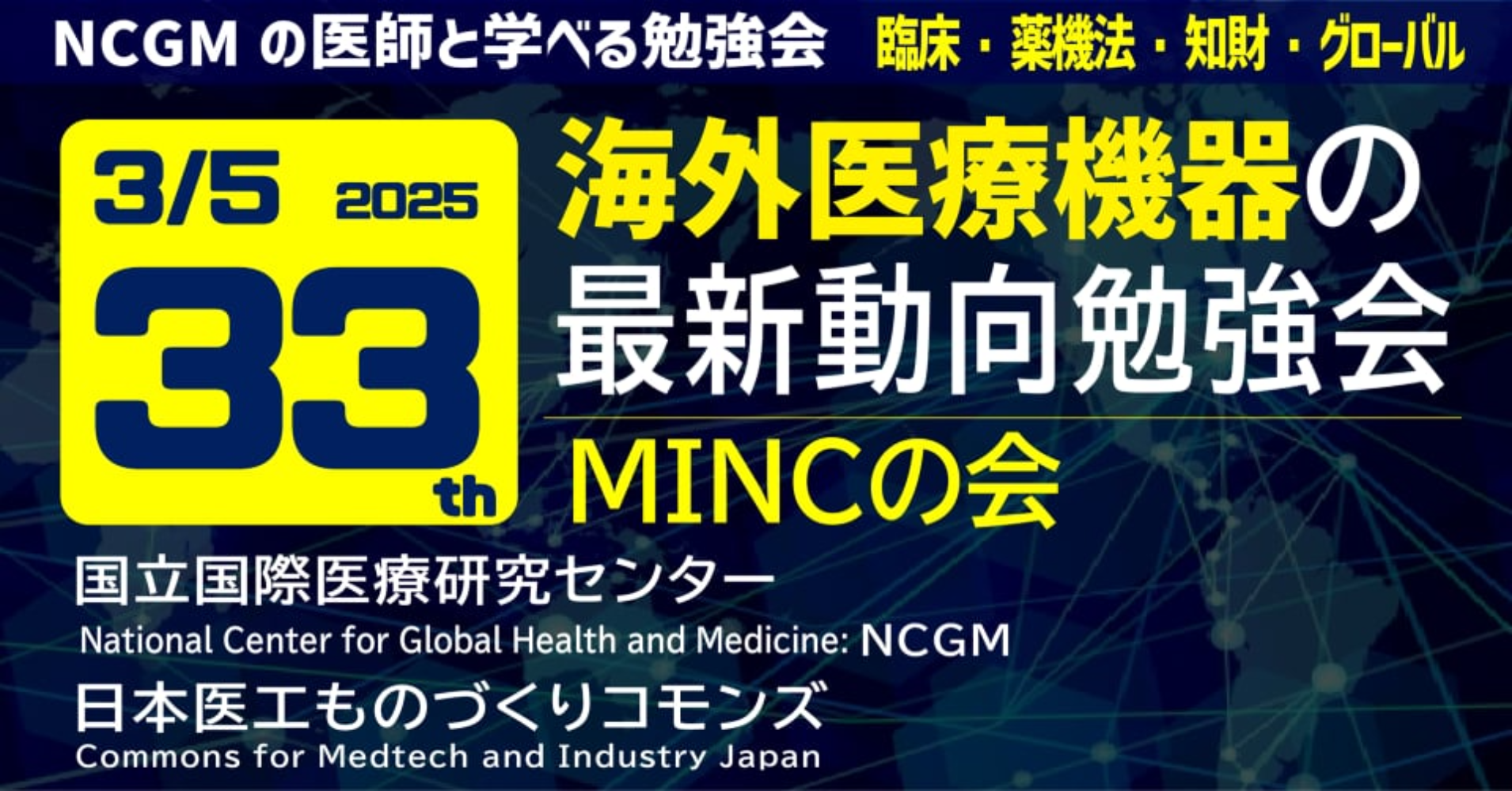 日本医工ものづくりコモンズでは、国立国際医療研究センター(NCGM)と正式に提携して、医療機器開発に関する交流を目的とした海外医療機器最新動向勉強会(MINCの会(Medical Innovation by NCGM and Commons))を開催しています。