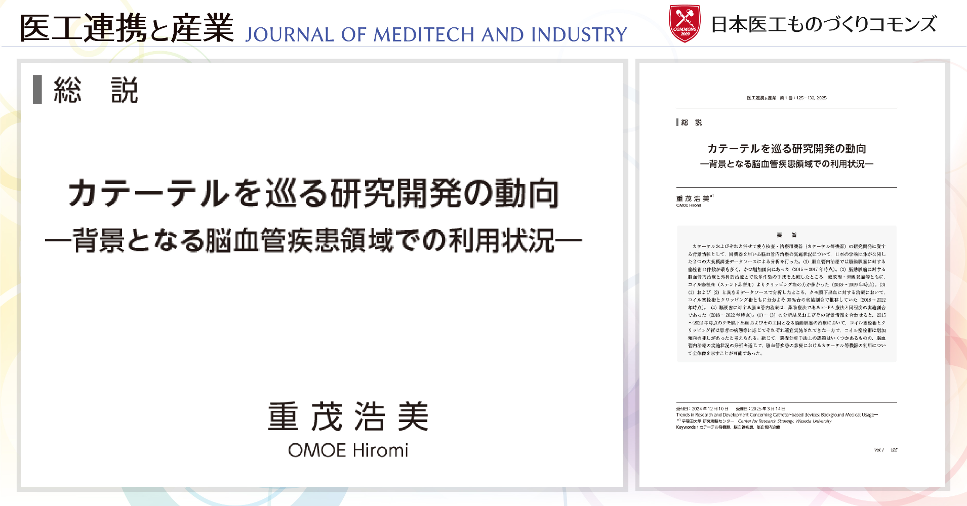 カテーテルおよびそれと併せて使う検査・治療用機器(カテーテル等機器)の研究開発に資する背景情報として,同機器を用いる脳血管内治療の実施状況について,日本の学術団体が公開した2 つの大規模調査データソースによる分析を行った。